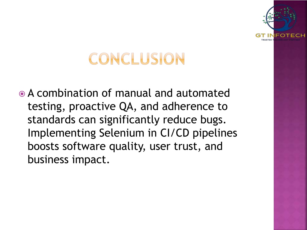 A combination of manual and automated testing, proactive QA, and adherence to standards can significantly reduce bugs. Implementing Selenium in CI/CD pipelines boosts software quality, user trust, and business impact.