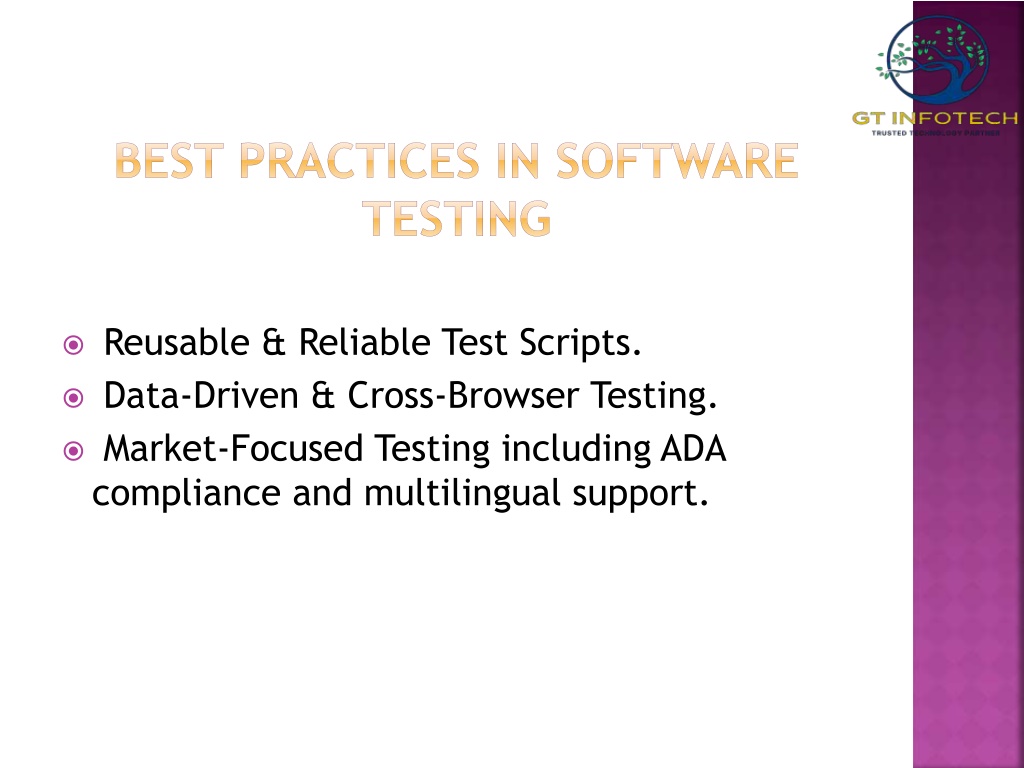 Reusable & Reliable Test Scripts. Data-Driven & Cross-Browser Testing. Market-Focused Testing including ADA compliance and multilingual support.