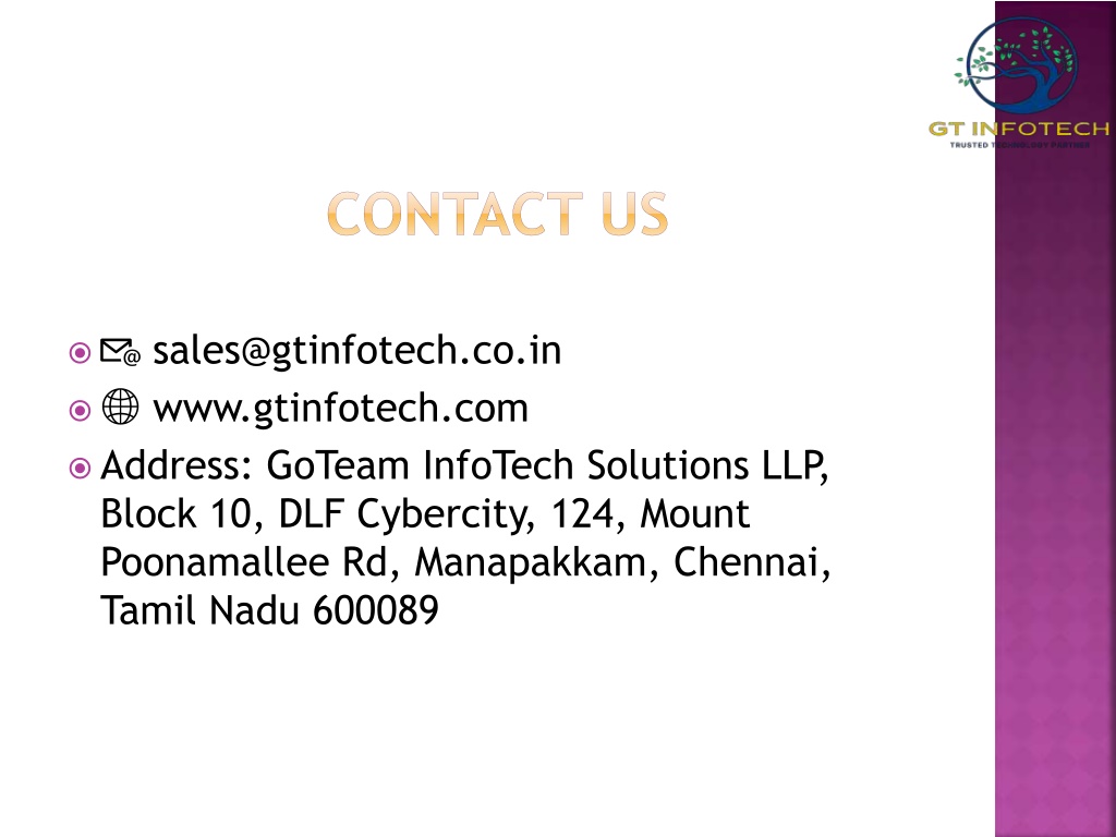 ? sales@gtinfotech.co.in ? www.gtinfotech.com Address: GoTeam InfoTech Solutions LLP, Block 10, DLF Cybercity, 124, Mount Poonamallee Rd, Manapakkam, Chennai, Tamil Nadu 600089