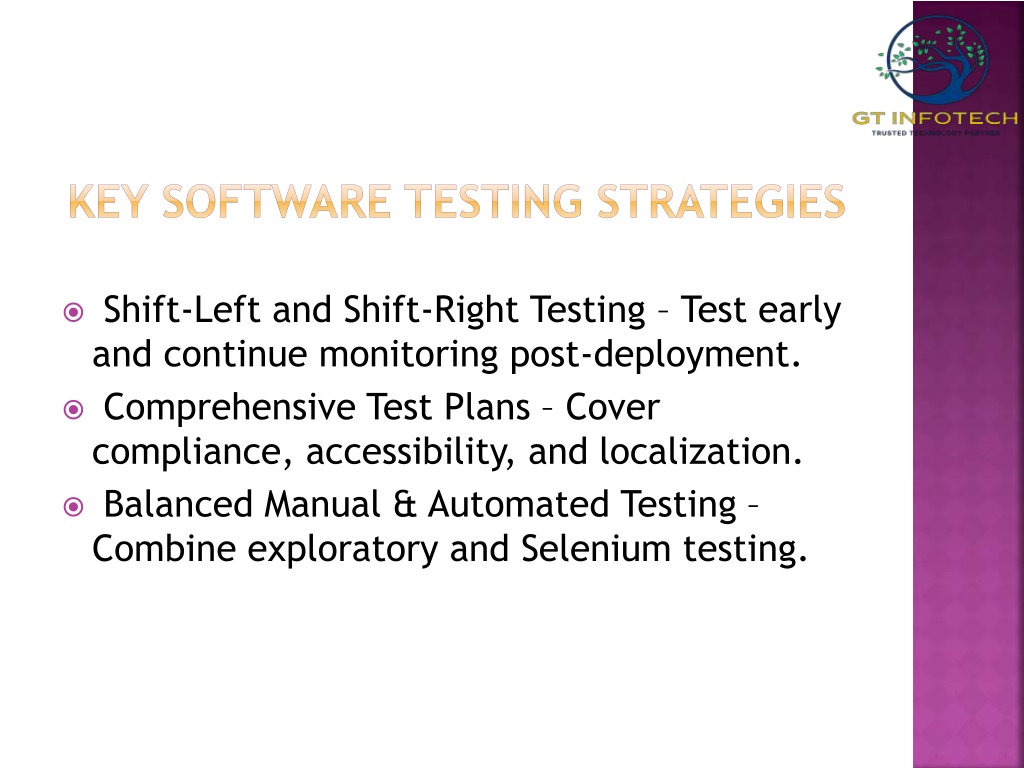 Shift-Left and Shift-Right Testing – Test early and continue monitoring post-deployment. Comprehensive Test Plans – Cover compliance, accessibility, and localization. Balanced Manual & Automated Testing – Combine exploratory and Selenium testing.