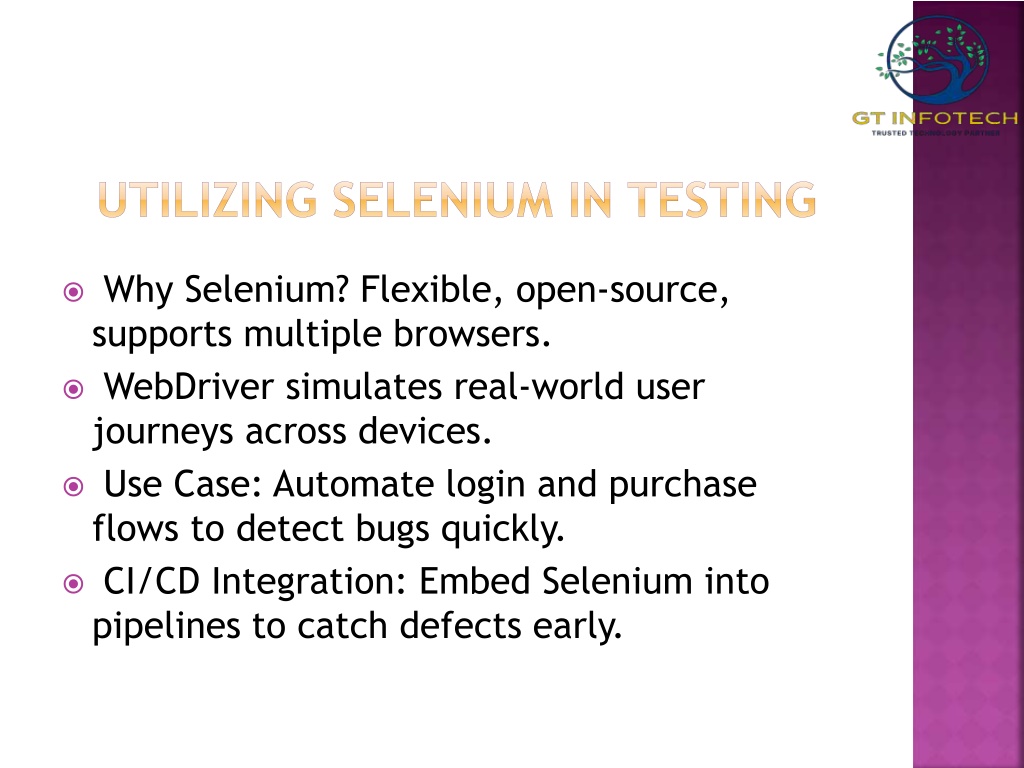 Why Selenium? Flexible, open-source, supports multiple browsers. WebDriver simulates real-world user journeys across devices. Use Case: Automate login and purchase flows to detect bugs quickly. CI/CD Integration: Embed Selenium into pipelines to catch defects early.