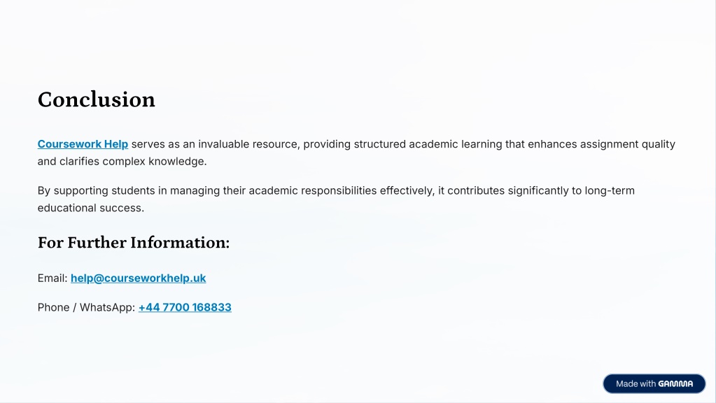 Conclusion Coursework Help serves as an invaluable resource, providing structured academic learning that enhances assignment quality and clarifies complex knowledge. By supporting students in managing their academic responsibilities effectively, it contributes significantly to long-term educational success. For Further Information: Email: help@courseworkhelp.uk Phone / WhatsApp: +44 7700 168833