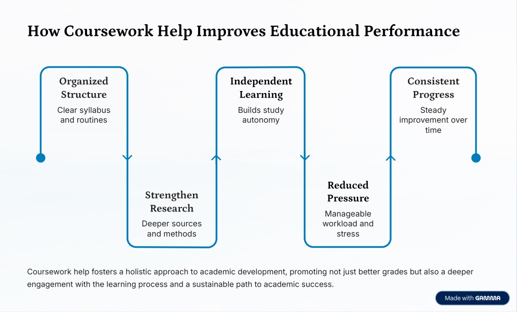 How Coursework Help Improves Educational Performance Organized Structure Independent Learning Consistent Progress Clear syllabus and routines Builds study autonomy Steady improvement over time Reduced Pressure Strengthen Research Manageable workload and stress Deeper sources and methods Coursework help fosters a holistic approach to academic development, promoting not just better grades but also a deeper engagement with the learning process and a sustainable path to academic success.