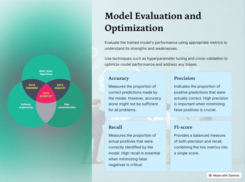 Model Evaluation and Optimization Evaluate the trained model's performance using appropriate metrics to understand its strengths and weaknesses. Use techniques such as hyperparameter tuning and cross-validation to optimize model performance and address any biases. Accuracy Precision Measures the proportion of correct predictions made by the model. However, accuracy alone might not be sufficient for all problems. Indicates the proportion of positive predictions that were actually correct. High precision is important when minimizing false positives is crucial. Recall F1-score Measures the proportion of actual positives that were correctly identified by the model. High recall is essential when minimizing false negatives is critical. Provides a balanced measure of both precision and recall, combining the two metrics into a single score.