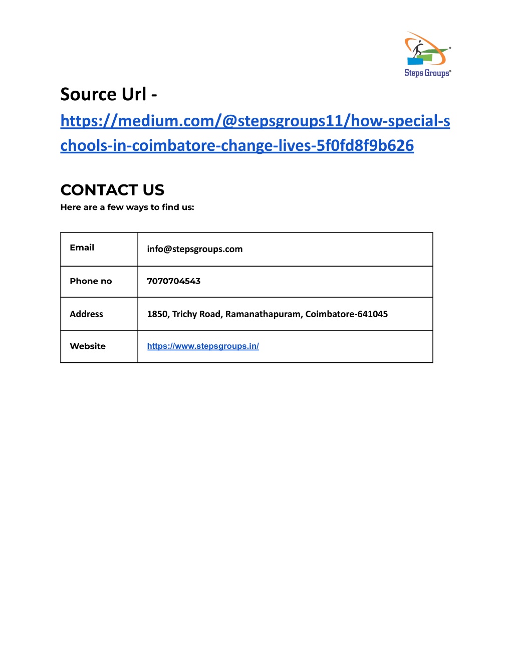 Source Url - https://medium.com/@stepsgroups11/how-special-s chools-in-coimbatore-change-lives-5f0fd8f9b626 CONTACT US Here are a few ways to find us: Email info@stepsgroups.com Phone no 7070704543 Address 1850, Trichy Road, Ramanathapuram, Coimbatore-641045 https://www.stepsgroups.in/ Website