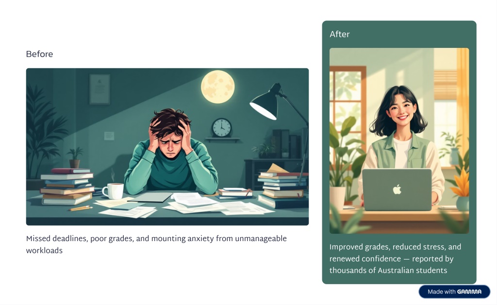 After Before Missed deadlines, poor grades, and mounting anxiety from unmanageable workloads Improved grades, reduced stress, and renewed confidence — reported by thousands of Australian students