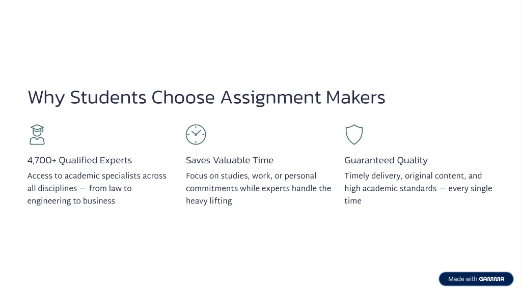 Why Students Choose Assignment Makers 4,700+ Qualified Experts Access to academic specialists across all disciplines — from law to engineering to business Saves Valuable Time Focus on studies, work, or personal commitments while experts handle the heavy lifting Guaranteed Quality Timely delivery, original content, and high academic standards — every single time