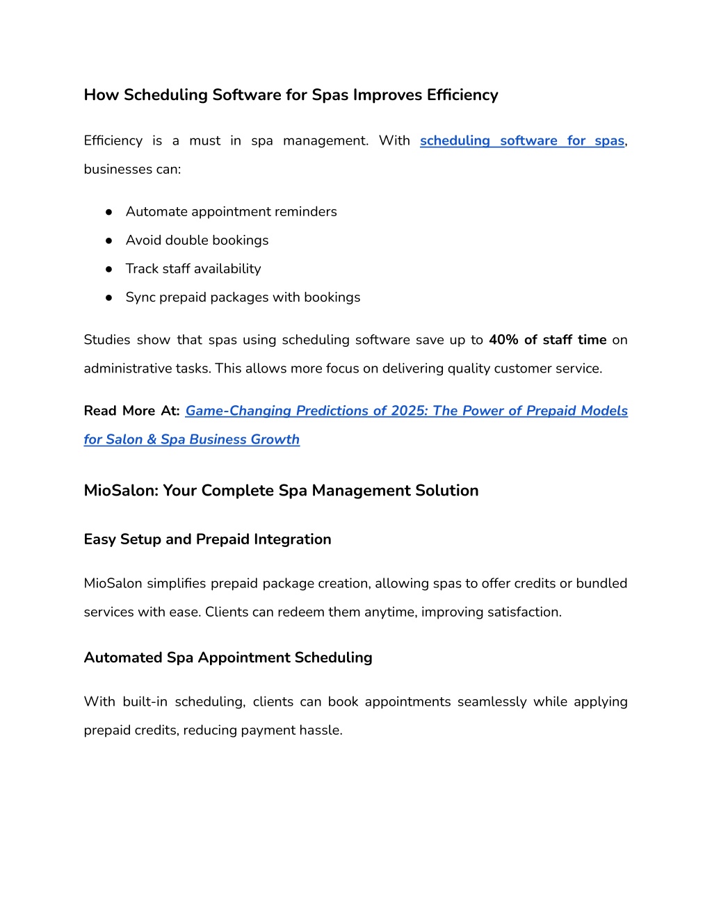 How Scheduling Software for Spas Improves Efficiency Efficiency is a must in spa management. With scheduling software for spas, businesses can: ● Automate appointment reminders ● Avoid double bookings ● Track staff availability ● Sync prepaid packages with bookings Studies show that spas using scheduling software save up to 40% of staff time on administrative tasks. This allows more focus on delivering quality customer service. Read More At: Game-Changing Predictions of 2025: The Power of Prepaid Models for Salon & Spa Business Growth MioSalon: Your Complete Spa Management Solution Easy Setup and Prepaid Integration MioSalon simplifies prepaid package creation, allowing spas to offer credits or bundled services with ease. Clients can redeem them anytime, improving satisfaction. Automated Spa Appointment Scheduling With built-in scheduling, clients can book appointments seamlessly while applying prepaid credits, reducing payment hassle.