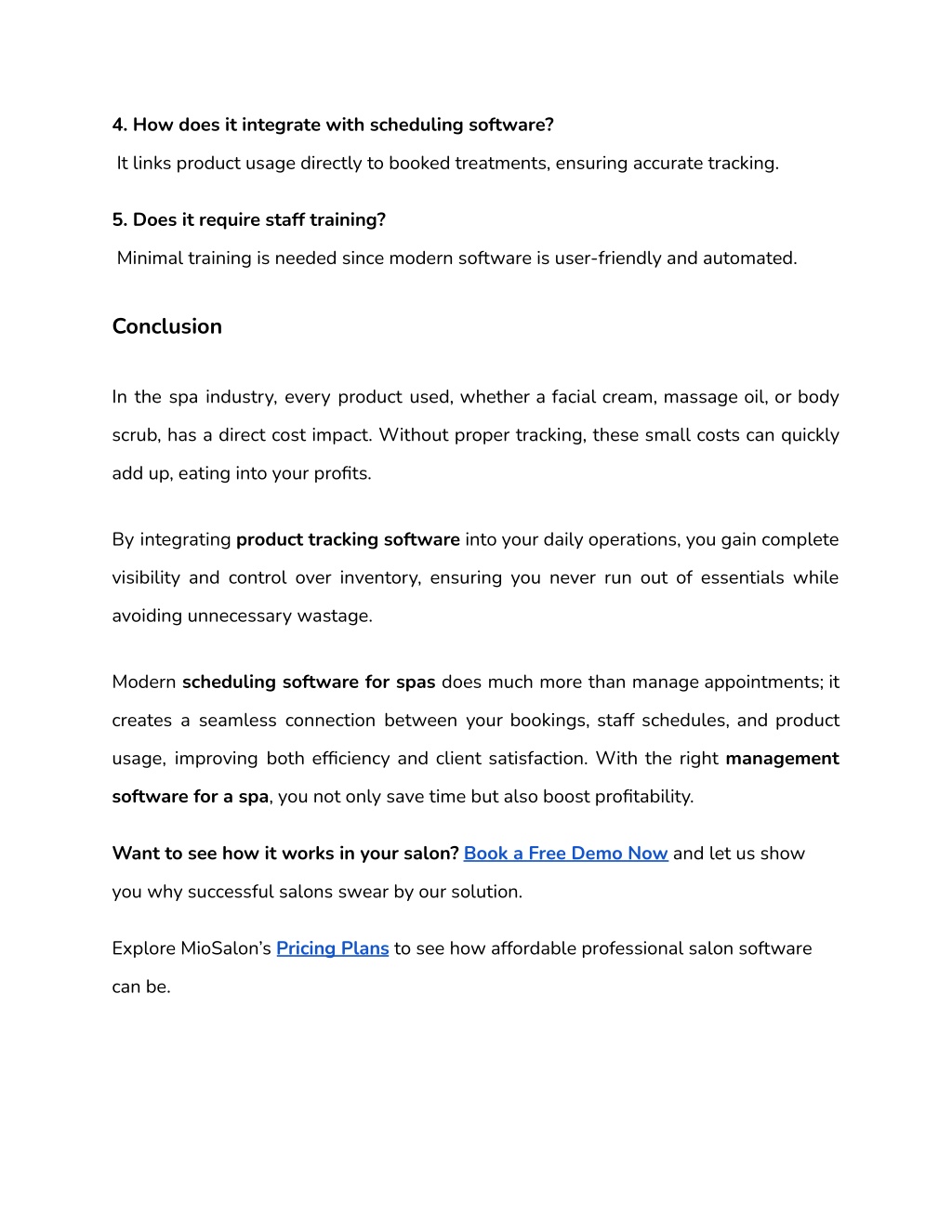 4. How does it integrate with scheduling software? It links product usage directly to booked treatments, ensuring accurate tracking. 5. Does it require staff training? Minimal training is needed since modern software is user-friendly and automated. Conclusion In the spa industry, every product used, whether a facial cream, massage oil, or body scrub, has a direct cost impact. Without proper tracking, these small costs can quickly add up, eating into your profits. By integrating product tracking software into your daily operations, you gain complete visibility and control over inventory, ensuring you never run out of essentials while avoiding unnecessary wastage. Modern scheduling software for spas does much more than manage appointments; it creates a seamless connection between your bookings, staff schedules, and product usage, improving both efficiency and client satisfaction. With the right management software for a spa, you not only save time but also boost profitability. Want to see how it works in your salon?Book a Free Demo Now and let us show you why successful salons swear by our solution. Explore MioSalon’s Pricing Plans to see how affordable professional salon software can be.