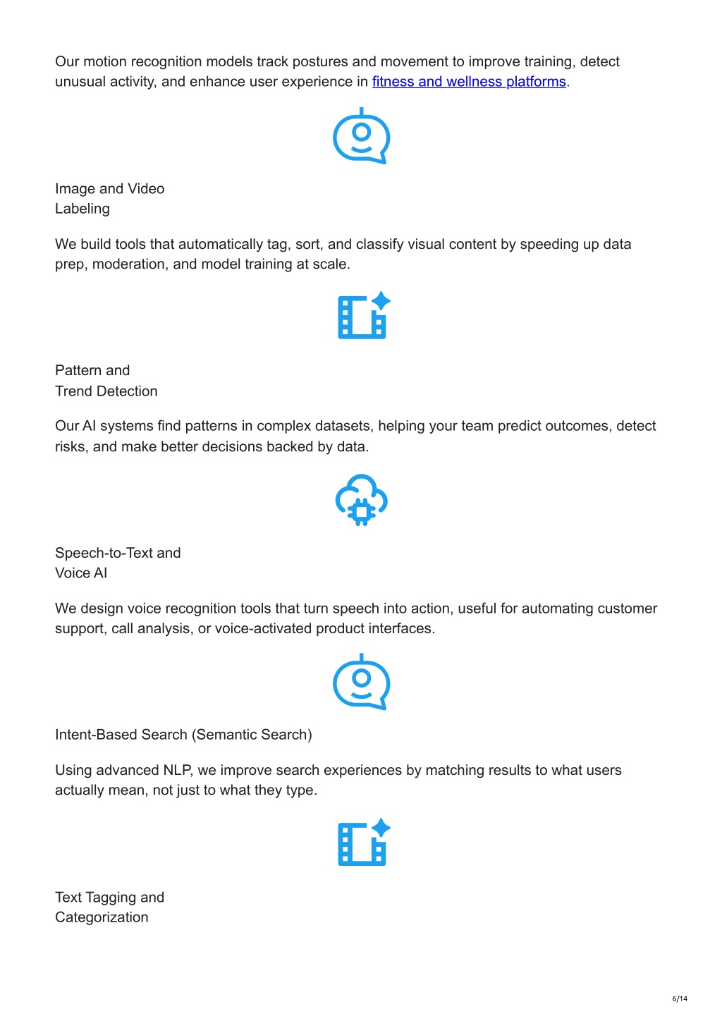 6. Our motion recognition models track postures and movement to improve training, detect unusual activity, and enhance user experience in fitness and wellness platforms. Image and Video Labeling We build tools that automatically tag, sort, and classify visual content by speeding up data prep, moderation, and model training at scale. Pattern and Trend Detection Our AI systems find patterns in complex datasets, helping your team predict outcomes, detect risks, and make better decisions backed by data. Speech-to-Text and Voice AI We design voice recognition tools that turn speech into action, useful for automating customer support, call analysis, or voice-activated product interfaces. Intent-Based Search (Semantic Search) Using advanced NLP, we improve search experiences by matching results to what users actually mean, not just to what they type. Text Tagging and Categorization 6/14
