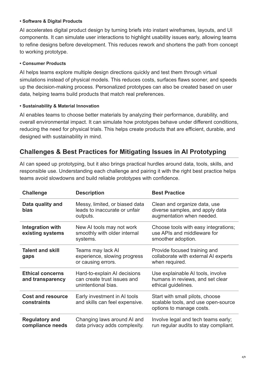 • Software & Digital Products AI accelerates digital product design by turning briefs into instant wireframes, layouts, and UI components. It can simulate user interactions to highlight usability issues early, allowing teams to refine designs before development. This reduces rework and shortens the path from concept to working prototype. • Consumer Products AI helps teams explore multiple design directions quickly and test them through virtual simulations instead of physical models. This reduces costs, surfaces flaws sooner, and speeds up the decision-making process. Personalized prototypes can also be created based on user data, helping teams build products that match real preferences. • Sustainability & Material Innovation AI enables teams to choose better materials by analyzing their performance, durability, and overall environmental impact. It can simulate how prototypes behave under different conditions, reducing the need for physical trials. This helps create products that are efficient, durable, and designed with sustainability in mind. Challenges & Best Practices for Mitigating Issues in AI Prototyping AI can speed up prototyping, but it also brings practical hurdles around data, tools, skills, and responsible use. Understanding each challenge and pairing it with the right best practice helps teams avoid slowdowns and build reliable prototypes with confidence. Challenge Description Best Practice Data quality and bias Messy, limited, or biased data leads to inaccurate or unfair outputs. Clean and organize data, use diverse samples, and apply data augmentation when needed. Integration with existing systems New AI tools may not work smoothly with older internal systems. Choose tools with easy integrations; use APIs and middleware for smoother adoption. Talent and skill gaps Teams may lack AI experience, slowing progress or causing errors. Provide focused training and collaborate with external AI experts when required. Ethical concerns and transparency Hard-to-explain AI decisions can create trust issues and unintentional bias. Use explainable AI tools, involve humans in reviews, and set clear ethical guidelines. Cost and resource constraints Early investment in AI tools and skills can feel expensive. Start with small pilots, choose scalable tools, and use open-source options to manage costs. Regulatory and compliance needs Changing laws around AI and data privacy adds complexity. Involve legal and tech teams early; run regular audits to stay compliant. 4/9