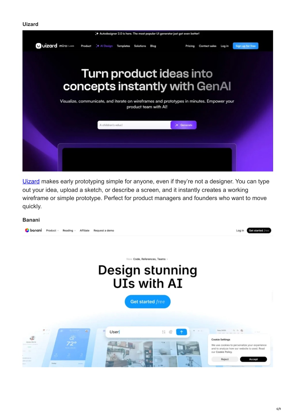 Uizard Uizard makes early prototyping simple for anyone, even if they’re not a designer. You can type out your idea, upload a sketch, or describe a screen, and it instantly creates a working wireframe or simple prototype. Perfect for product managers and founders who want to move quickly. Banani 6/9