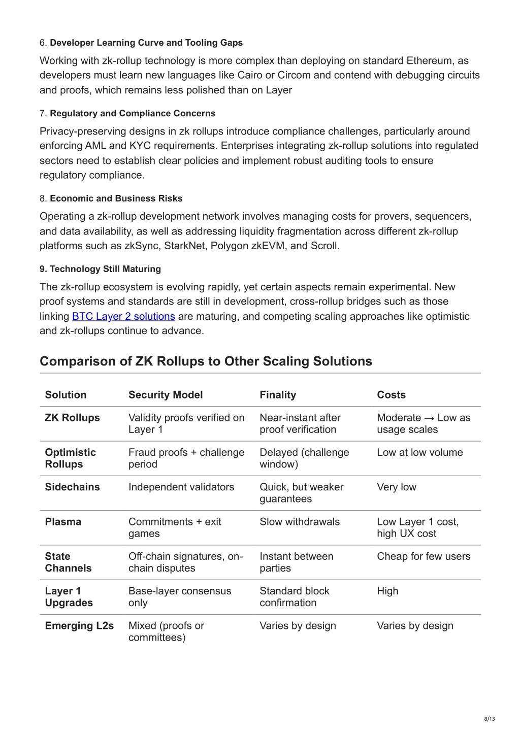 6. Developer Learning Curve and Tooling Gaps Working with zk-rollup technology is more complex than deploying on standard Ethereum, as developers must learn new languages like Cairo or Circom and contend with debugging circuits and proofs, which remains less polished than on Layer 7. Regulatory and Compliance Concerns Privacy-preserving designs in zk rollups introduce compliance challenges, particularly around enforcing AML and KYC requirements. Enterprises integrating zk-rollup solutions into regulated sectors need to establish clear policies and implement robust auditing tools to ensure regulatory compliance. 8. Economic and Business Risks Operating a zk-rollup development network involves managing costs for provers, sequencers, and data availability, as well as addressing liquidity fragmentation across different zk-rollup platforms such as zkSync, StarkNet, Polygon zkEVM, and Scroll. 9. Technology Still Maturing The zk-rollup ecosystem is evolving rapidly, yet certain aspects remain experimental. New proof systems and standards are still in development, cross-rollup bridges such as those linking BTC Layer 2 solutions are maturing, and competing scaling approaches like optimistic and zk-rollups continue to advance. Comparison of ZK Rollups to Other Scaling Solutions Solution Security Model Finality Costs ZK Rollups Validity proofs verified on Layer 1 Near-instant after proof verification Moderate → Low as usage scales Optimistic Rollups Fraud proofs + challenge period Delayed (challenge window) Low at low volume Sidechains Independent validators Quick, but weaker guarantees Very low Plasma Commitments + exit games Slow withdrawals Low Layer 1 cost, high UX cost State Channels Off-chain signatures, on- chain disputes Instant between parties Cheap for few users Layer 1 Upgrades Base-layer consensus only Standard block confirmation High Emerging L2s Mixed (proofs or committees) Varies by design Varies by design 8/13