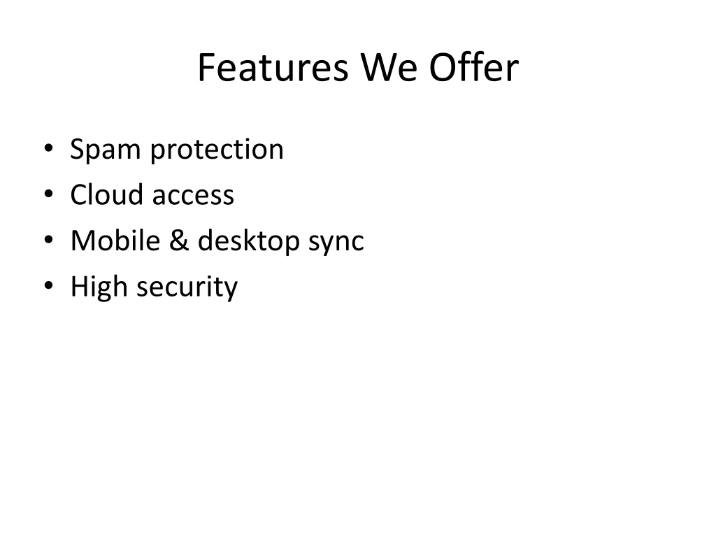 Features We Offer • Spam protection • Cloud access • Mobile & desktop sync • High security