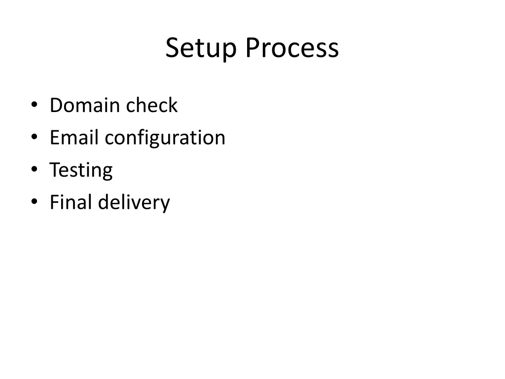 Setup Process • Domain check • Email configuration • Testing • Final delivery