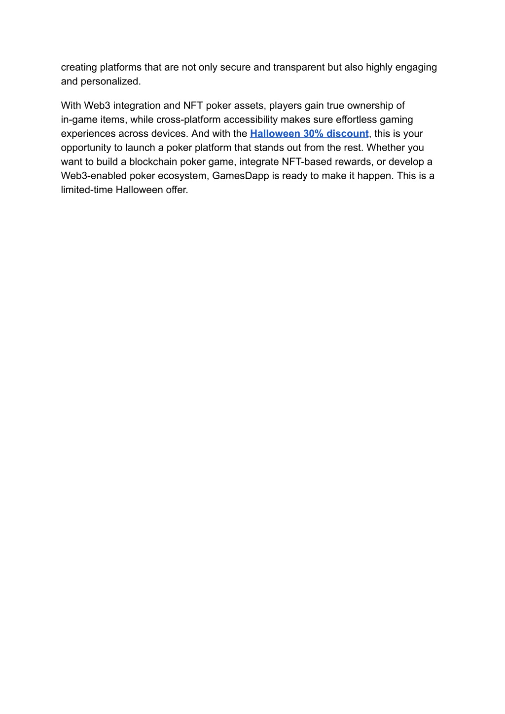 3. creating platforms that are not only secure and transparent but also highly engaging and personalized. With Web3 integration and NFT poker assets, players gain true ownership of in-game items, while cross-platform accessibility makes sure effortless gaming experiences across devices. And with theHalloween 30% discount, this is your opportunity to launch a poker platform that stands out from the rest. Whether you want to build a blockchain poker game, integrate NFT-based rewards, or develop a Web3-enabled poker ecosystem, GamesDapp is ready to make it happen. This is a limited-time Halloween offer.