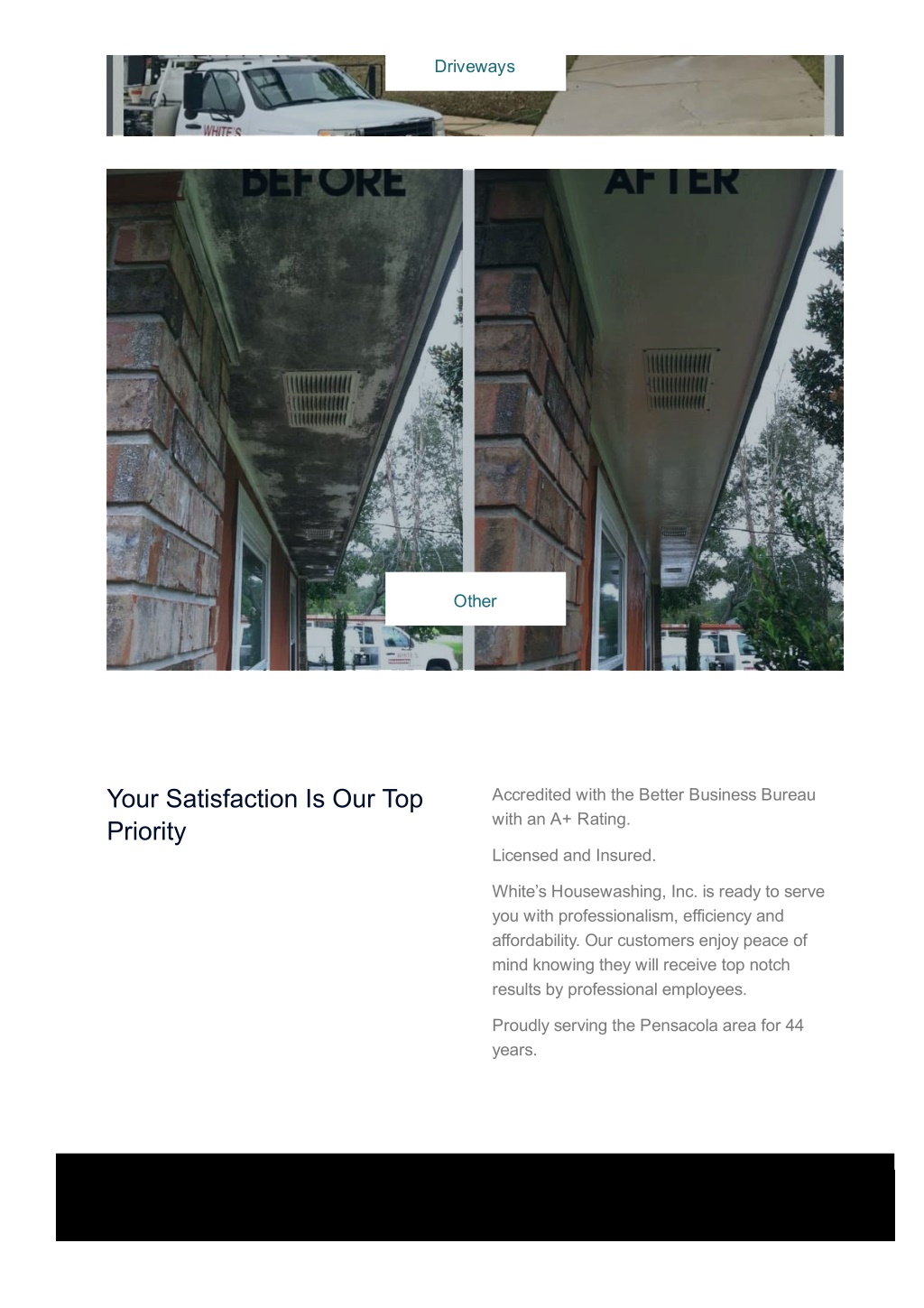 Driveways Other Your Satisfaction Is Our Top Priority Accredited with the Better Business Bureau with an A+ Rating. Licensed and Insured. White’s Housewashing, Inc. is ready to serve you with professionalism, efficiency and affordability. Our customers enjoy peace of mind knowing they will receive top notch results by professional employees. Proudly serving the Pensacola area for 44 years.