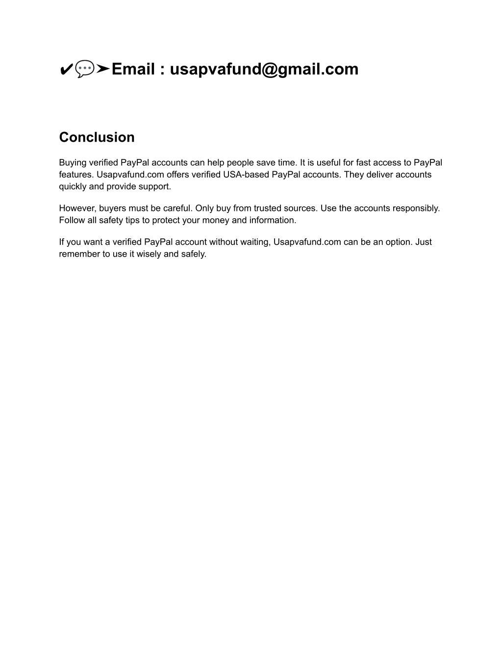 ✔?➤Email : usapvafund@gmail.com Conclusion Buying verified PayPal accounts can help people save time. It is useful for fast access to PayPal features. Usapvafund.com offers verified USA-based PayPal accounts. They deliver accounts quickly and provide support. However, buyers must be careful. Only buy from trusted sources. Use the accounts responsibly. Follow all safety tips to protect your money and information. If you want a verified PayPal account without waiting, Usapvafund.com can be an option. Just remember to use it wisely and safely.