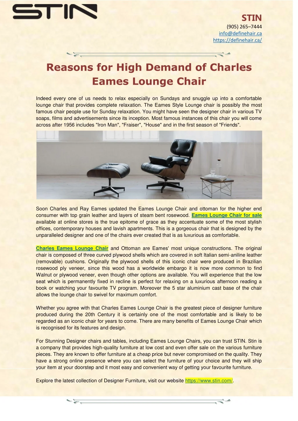 STIN (905) 265–7444 info@definehair.ca https://definehair.ca/ Reasons for High Demand of Charles Eames Lounge Chair Indeed every one of us needs to relax especially on Sundays and snuggle up into a comfortable lounge chair that provides complete relaxation. The Eames Style Lounge chairis possibly the most famous chair people use for Sunday relaxation. You might have seen the designer chair in various TV soaps, films and advertisements since its inception. Most famous instances of this chair you will come across after 1956 includes "Iron Man", "Fraiser", "House" and in the first season of "Friends". Soon Charles and Ray Eames updated the Eames Lounge Chair and ottoman for the higher end consumer with top grain leather and layers of steam bent rosewood. Eames Lounge Chair for sale available at online stores is the true epitome of grace as they accentuate some of the most stylish offices, contemporary houses and lavish apartments. This is a gorgeous chair that is designed by the unparalleled designer and one of the chairs ever created that is as luxurious as comfortable. Charles Eames Lounge Chair and Ottoman are Eames' most unique constructions. The original chair is composed of three curved plywood shells which are covered in soft Italian semi-aniline leather (removable) cushions. Originally the plywood shells of this iconic chair were produced in Brazilian rosewood ply veneer, since this wood has a worldwide embargo it is now more common to find Walnut or plywood veneer, even though other options are available. You will experience that the low seat which is permanently fixed in recline is perfect for relaxing on a luxurious afternoon reading a book or watching your favourite TV program. Moreover the 5 star aluminium cast base of the chair allows the lounge chair to swivel for maximum comfort. Whether you agree with that Charles Eames Lounge Chair is the greatest piece of designer furniture produced during the 20th Century it is certainly one of the most comfortable and is likely to be regarded as an iconic chair for years to come. There are many benefits of Eames Lounge Chairwhich is recognised for its features and design. For Stunning Designer chairs and tables, including Eames Lounge Chairs, you can trust STIN. Stin is a company that provides high-quality furniture at low cost and even offer sale on the various furniture pieces. They are known to offer furniture at a cheap price but never compromised on the quality. They have a strong online presence where you can select the furniture of your choice and they will ship your item at your doorstep and it most easy and convenient way of getting your favourite furniture. Explore the latest collection of Designer Furniture, visit our website https://www.stin.com/.
