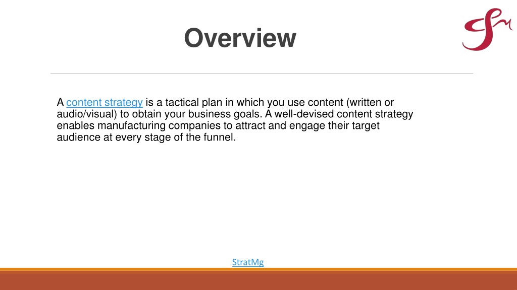 Overview A content strategy is a tactical plan in which you use content (written or audio/visual) to obtain your business goals. A well-devised content strategy enables manufacturing companies to attract and engage their target audience at every stage of the funnel. StratMg