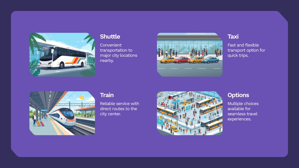 Shuttle Taxi Convenient transportation to major city locations nearby. Fast and flexible transport option for quick trips. Train Options Reliable service with direct routes to the city center. Multiple choices available for seamless travel experiences.