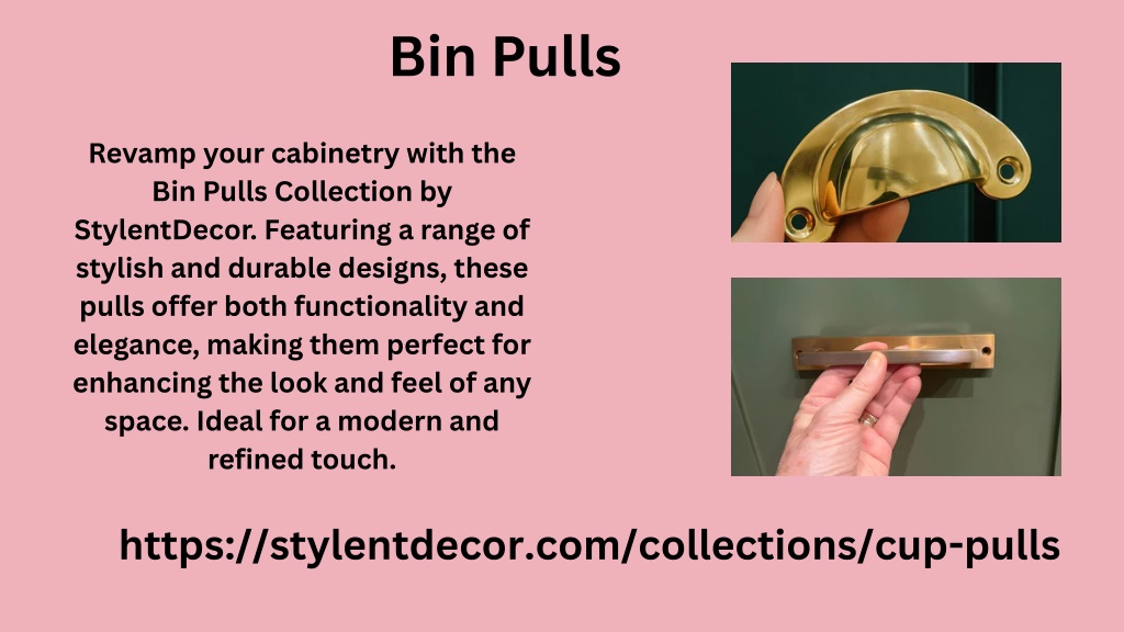 Bin Pulls Revamp your cabinetry with the Bin Pulls Collection by StylentDecor. Featuring a range of stylish and durable designs, these pulls offer both functionality and elegance, making them perfect for enhancing the look and feel of any space. Ideal for a modern and refined touch. https://stylentdecor.com/collections/cup-pulls