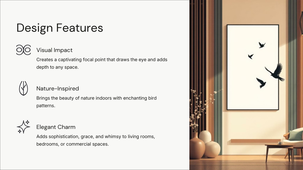 5. Design Features Visual Impact Creates a captivating focal point that draws the eye and adds depth to any space. Nature-Inspired Brings the beauty of nature indoors with enchanting bird patterns. Elegant Charm Adds sophistication, grace, and whimsy to living rooms, bedrooms, or commercial spaces.