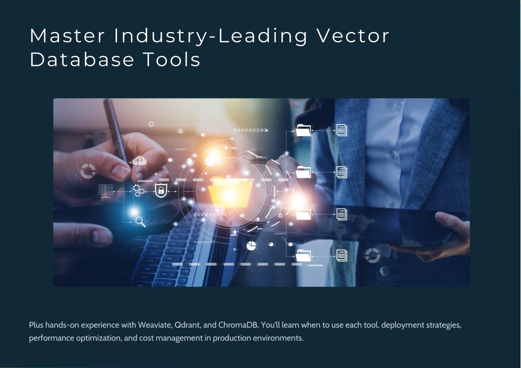 Master Industry-Leading Vector Database Tools Plus hands-on experience with Weaviate, Qdrant, and ChromaDB. You'll learn when to use each tool, deployment strategies, performance optimization, and cost management in production environments.
