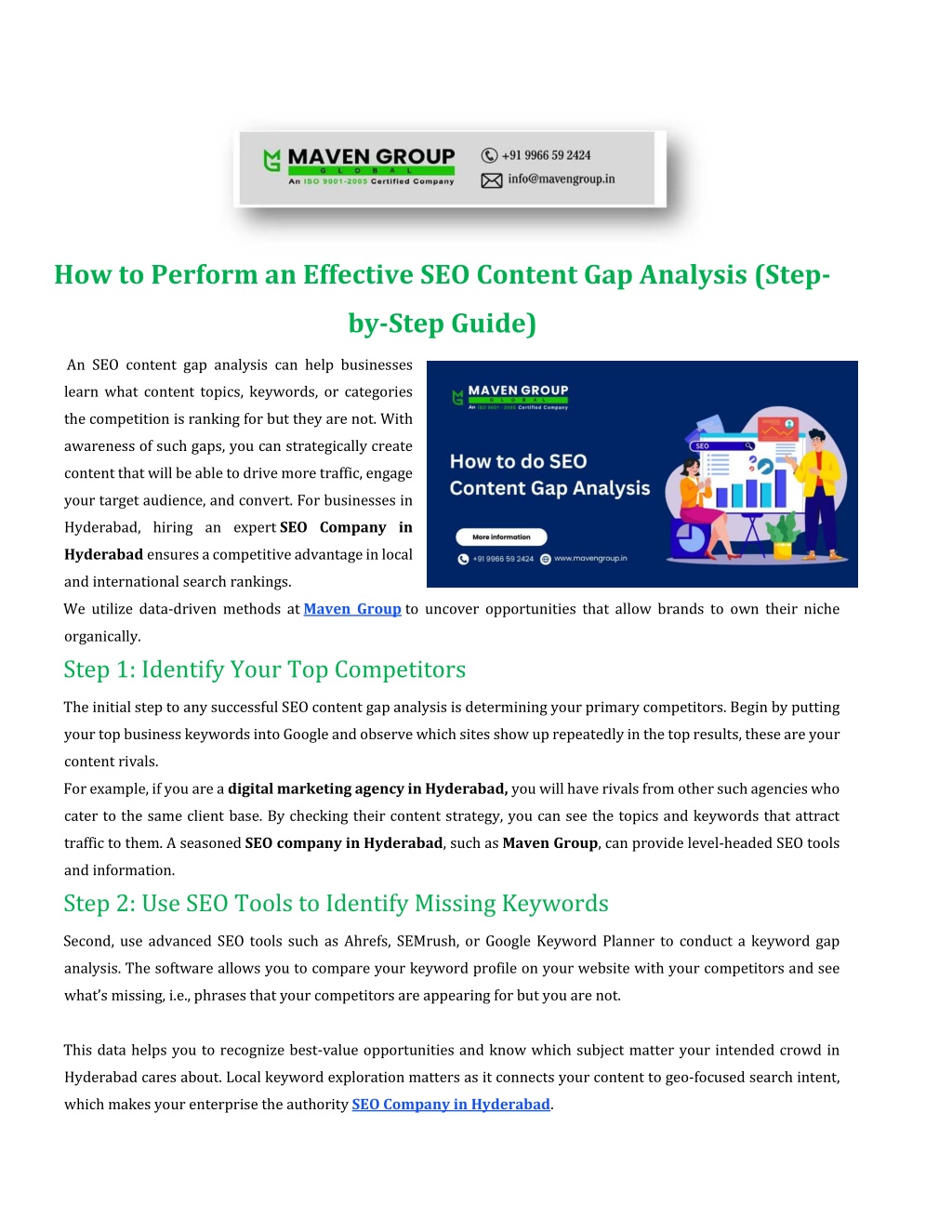 Master SEO content gap analysis with this complete guide. Maven Group, an expert SEO Company in Hyderabad, helps you improve site visibility.<br>An SEO content gap analysis can help businesses learn what content topics, keywords, or categories the competition is ranking for but they are not. With awareness of such gaps, you can strategically create content that will be able to drive more traffic, engage your target audience, and convert. For businesses in Hyderabad, hiring an expert SEO Company in Hyderabad ensures a competitive advantage in local and international search rankings.
