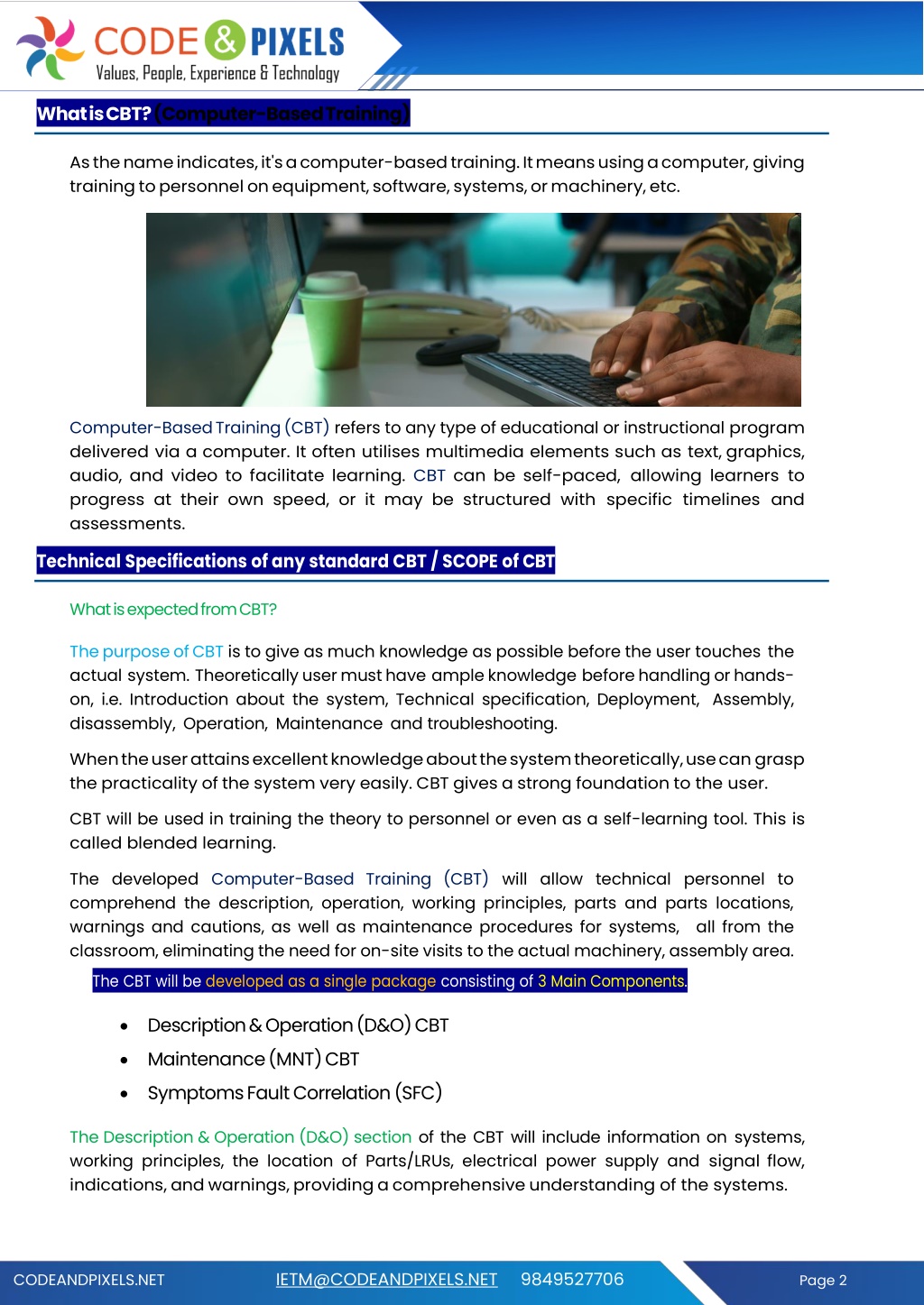 What is CBT? (Computer-Based Training) As the name indicates, it's a computer-based training. It means using a computer, giving training to personnel on equipment, software, systems, or machinery, etc. Computer-Based Training (CBT) refers to any type of educational or instructional program delivered via a computer. It often utilises multimedia elements such as text, graphics, audio, and video to facilitate learning. CBT can be self-paced, allowing learners to progress at their own speed, or it may be structured with specific timelines and assessments. TechnicalSpecificationsofanystandardCBT/SCOPEofCBT What is expected from CBT? The purpose of CBT is to give as much knowledge as possible before the user touches the actual system. Theoretically user must have ample knowledge before handling or hands- on, i.e. Introduction about the system, Technical specification, Deployment, Assembly, disassembly, Operation, Maintenance and troubleshooting. When the user attains excellent knowledge about the system theoretically, use can grasp the practicality of the system very easily. CBT gives a strong foundation to the user. CBT will be used in training the theory to personnel or even as a self-learning tool. This is called blended learning. The developed Computer-Based Training (CBT) will allow technical personnel to comprehend the description, operation, working principles, parts and parts locations, warnings and cautions, as well as maintenance procedures for systems, all from the classroom, eliminating the need for on-site visits to the actual machinery, assembly area. TheCBTwillbedevelopedasasinglepackageconsistingof3MainComponents. •Description & Operation (D&O) CBT •Maintenance (MNT) CBT •Symptoms Fault Correlation (SFC) The Description & Operation (D&O) section of the CBT will include information on systems, working principles, the location of Parts/LRUs, electrical power supply and signal flow, indications, and warnings, providing a comprehensive understanding of the systems. CODEANDPIXELS.NET IETM@CODEANDPIXELS.NET 9849527706 Page 2