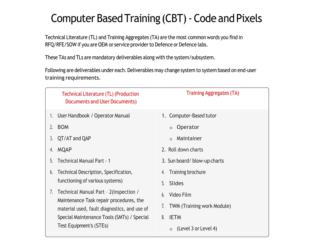 1. Computer Based Training (CBT) - Code and Pixels Technical Literature (TL) and Training Aggregates (TA) are the most common words you find in RFQ/RFE/SOW if you are OEM or service provider to Defence or Defence labs. These TAs and TLs are mandatory deliverables along with the system/subsystem. Following are deliverables under each. Deliverables may change system to system based on end-user training requirements. Training Aggregates (TA) Technical Literature (TL) (Production Documents and User Documents) 1.User Handbook / Operator Manual 1. Computer-Based tutor 2.BOM Operator 3.QT/AT and QAP Maintainer 4.MQAP 2. Roll down charts 5.Technical Manual Part - 1 3. Sun board/ blow-up charts 6.Technical Description, Specification, functioning of various systems) 4.Training brochure 5.Slides 7.Technical Manual Part – 2(Inspection / Maintenance Task repair procedures, the material used, fault diagnostics, and use of Special Maintenance Tools (SMTs) / Special TestEquipment’s(STEs) 6.Video Film 7.TWM (Training work Module) 8.IETM (Level 3 or Level 4)