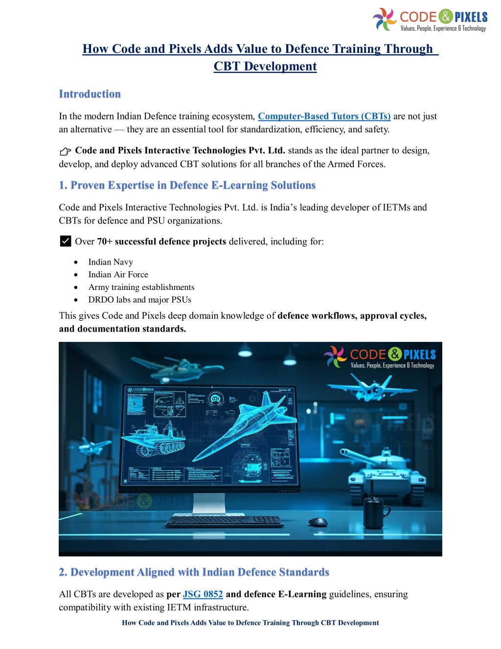 1. How Code and Pixels Adds Value to Defence Training Through CBT Development Introduction In the modern Indian Defence training ecosystem, Computer-Based Tutors (CBTs) are not just an alternative — they are an essential tool for standardization, efficiency, and safety. ?Code and Pixels Interactive Technologies Pvt. Ltd. stands as the ideal partner to design, develop, and deploy advanced CBT solutions for all branches of the Armed Forces. 1. Proven Expertise in Defence E-Learning Solutions Code and Pixels Interactive Technologies Pvt. Ltd. is India’s leading developer of IETMs and CBTs for defence and PSU organizations. ✅ Over 70+ successful defence projects delivered, including for: Indian Navy Indian Air Force Army training establishments DRDO labs and major PSUs This gives Code and Pixels deep domain knowledge of defence workflows, approval cycles, and documentation standards. 2. Development Aligned with Indian Defence Standards All CBTs are developed as per JSG 0852 and defence E-Learning guidelines, ensuring compatibility with existing IETM infrastructure. How Code and Pixels Adds Value to Defence Training Through CBT Development