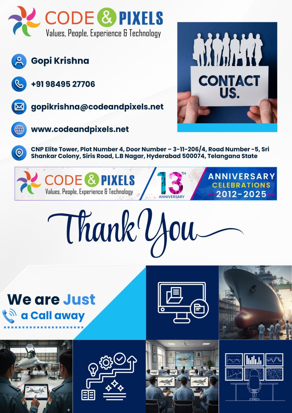 8. Conclusion: •The implementation of IETMs and CBTs has revolutionized the Indian Armed Forces’ training and operational ecosystem. •From the shipyards to missile facilities of DRDO, digital documentation and learning systems have created a connected, standardized, and knowledge- driven defense infrastructure. •These tools not only enhanced efficiency but also aligned India’s defense capability with global digital standards, making our Armed Forces more agile, self-reliant, and future-ready. “With IETMs and CBTs, the Indian Defense has transitioned from paper manuals to intelligent, interactive systems that think, learn, and evolve with every platform empowering every sailor, airman, and soldier with instant access to mission critical knowledge.” —Code and Pixels Interactive Technologies Pvt. Ltd. CODEANDPIXELS.NET IETM@CODEANDPIXELS.NET 9849527706 Page 8
