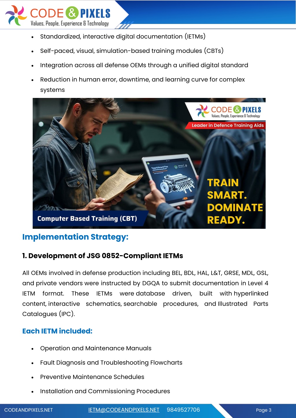 3. •Standardized, interactive digital documentation (IETMs) •Self-paced, visual, simulation-based training modules (CBTs) •Integration across all defense OEMs through a unified digital standard •Reduction in human error, downtime, and learning curve for complex systems Implementation Strategy: 1. Development of JSG 0852-Compliant IETMs All OEMs involved in defense production including BEL, BDL, HAL, L&T, GRSE, MDL, GSL, and private vendors were instructed by DGQA to submit documentation in Level 4 IETM format. These IETMs were database content, interactive schematics, searchable procedures, and Illustrated Parts Catalogues (IPC). driven, built with hyperlinked Each IETM included: •Operation and Maintenance Manuals •Fault Diagnosis and Troubleshooting Flowcharts •Preventive Maintenance Schedules •Installation and Commissioning Procedures CODEANDPIXELS.NET IETM@CODEANDPIXELS.NET 9849527706 Page 3