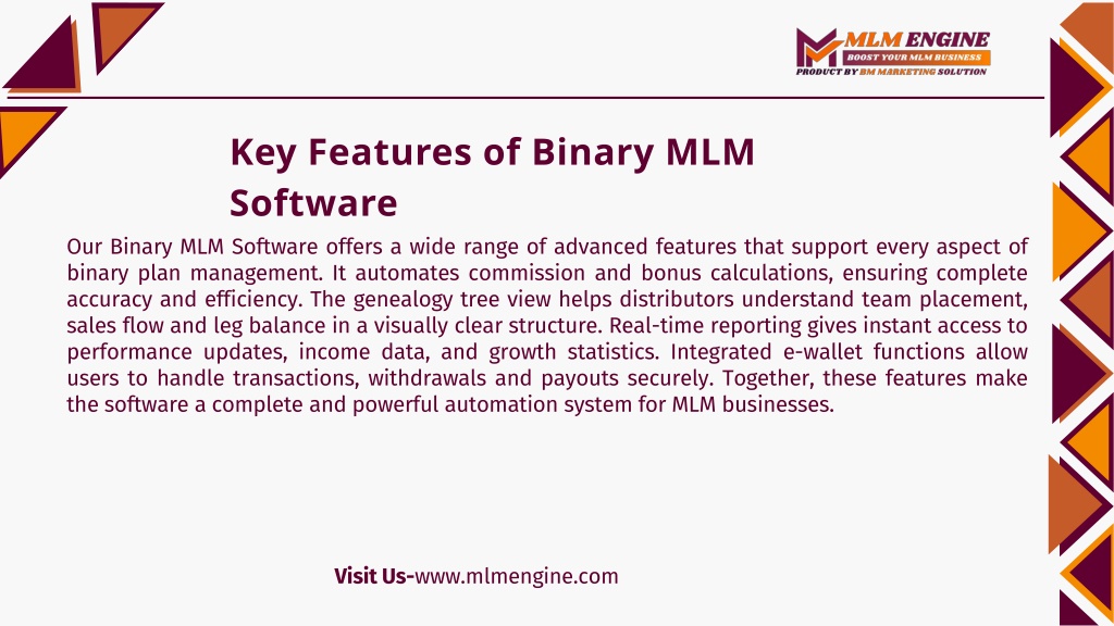 Key Features of Binary MLM Software Our Binary MLM Software offers a wide range of advanced features that support every aspect of binary plan management. It automates commission and bonus calculations, ensuring complete accuracy and efficiency. The genealogy tree view helps distributors understand team placement, sales flow and leg balance in a visually clear structure. Real-time reporting gives instant access to performance updates, income data, and growth statistics. Integrated e-wallet functions allow users to handle transactions, withdrawals and payouts securely. Together, these features make the software a complete and powerful automation system for MLM businesses. Visit Us-www.mlmengine.com