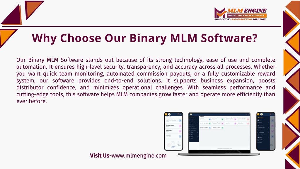 Binary MLM Software Our Binary MLM Software is designed specifically for companies that follow the Binary Compensation Plan, one of the most trusted and widely used structures in the network marketing industry. It helps businesses maintain a balanced team distribution by managing two legs left and right ensuring seamless growth and stability. The software automates all essential tasks such as member enrollment, performance tracking, sales monitoring and payout management. With advanced technology and a user-friendly interface, it enhances transparency, reduces manual errors and supports smooth business operations, helping organizations scale their network marketing business with confidence. Visit Us-www.mlmengine.com