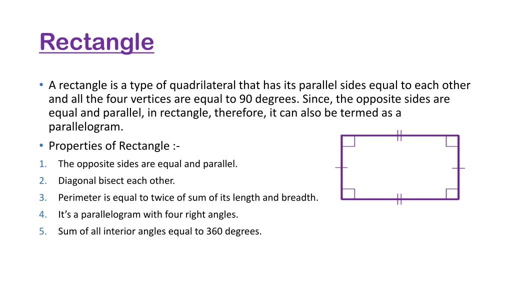 6. Rectangle • A rectangle is a type of quadrilateral that has its parallel sides equal to each other and all the four vertices are equal to 90 degrees. Since, the opposite sides are equal and parallel, in rectangle, therefore, it can also be termed as a parallelogram. • Properties of Rectangle :- 1. The opposite sides are equal and parallel. 2. Diagonal bisect each other. 3. Perimeter is equal to twice of sum of its length and breadth. 4. It’s a parallelogram with four right angles. 5. Sum of all interior angles equal to 360 degrees.