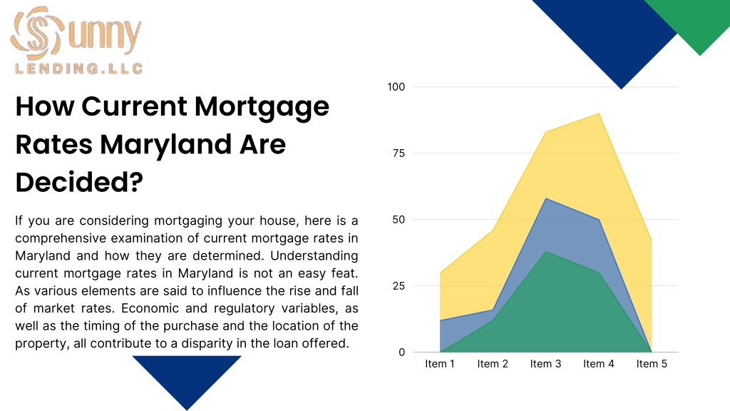 100 How Current Mortgage Rates Maryland Are Decided? 75 If you are considering mortgaging your house, here is a comprehensive examination of current mortgage rates in Maryland and how they are determined. Understanding current mortgage rates in Maryland is not an easy feat. As various elements are said to influence the rise and fall of market rates. Economic and regulatory variables, as well as the timing of the purchase and the location of the property, all contribute to a disparity in the loan offered. 50 25 0 Item 1 Item 2 Item 3 Item 4 Item 5