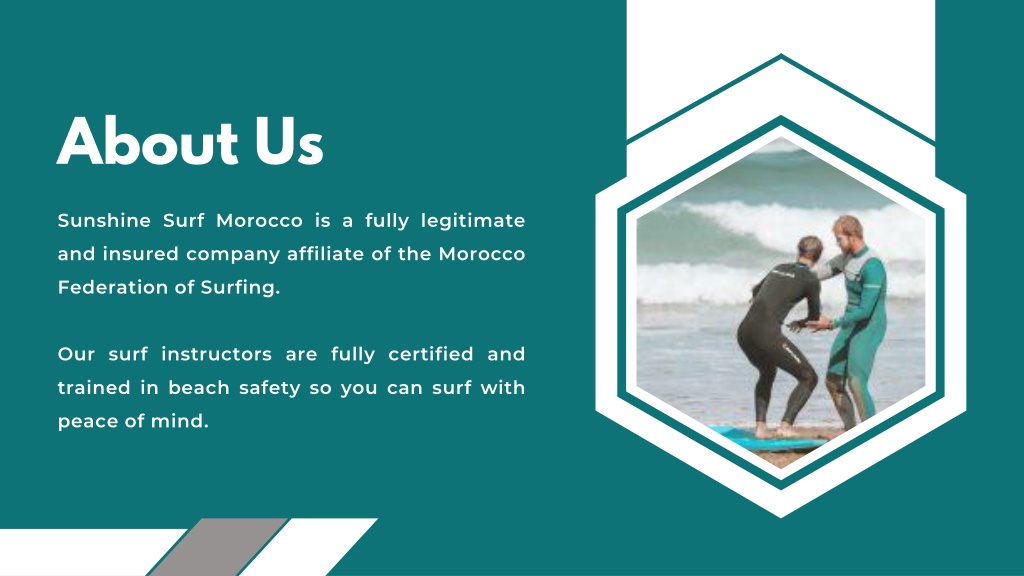 About Us Sunshine Surf Morocco is a fully legitimate and insured company affiliate of the Morocco Federation of Surfing. Our surf instructors are fully certified and trained in beach safety so you can surf with peace of mind.