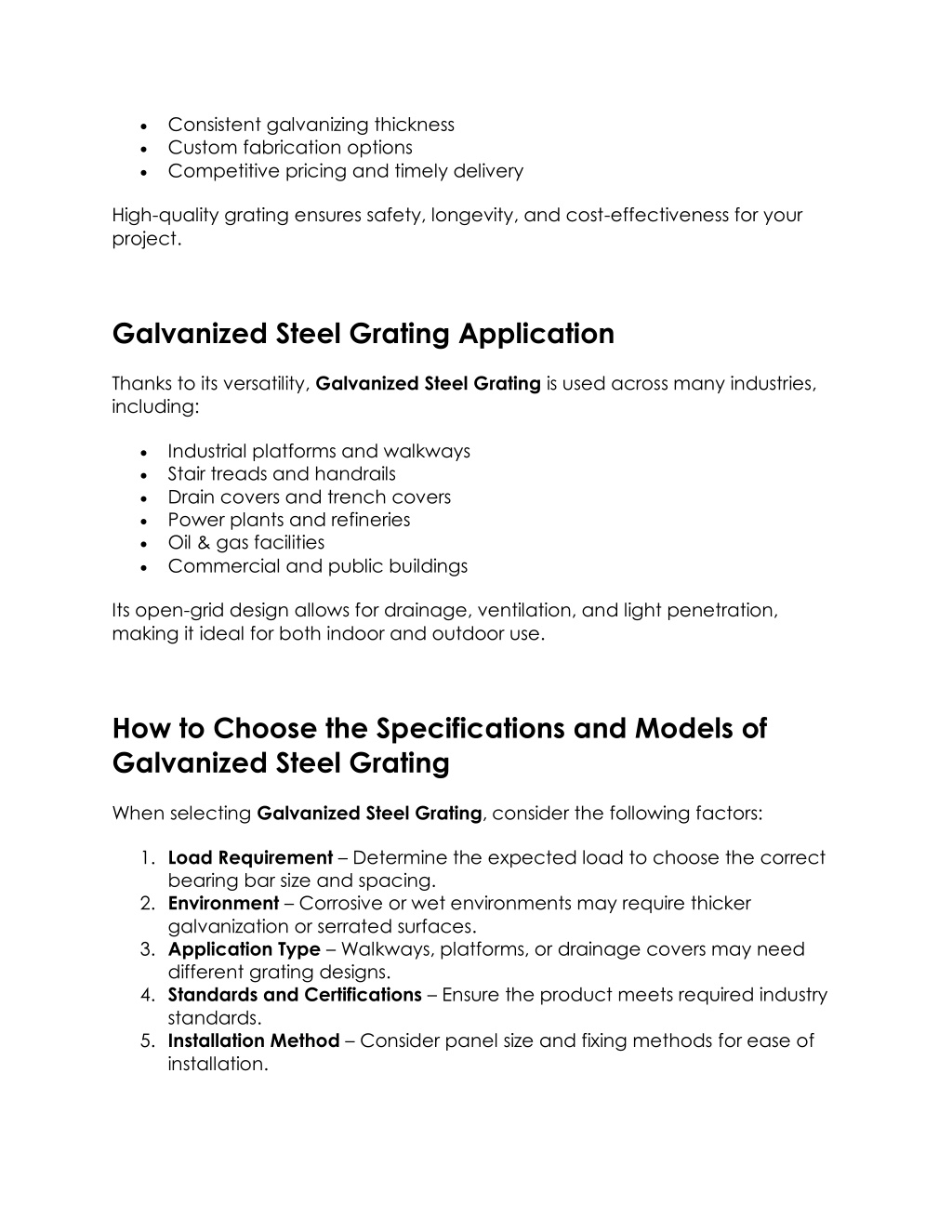 4. Consistent galvanizing thickness Custom fabrication options Competitive pricing and timely delivery High-quality grating ensures safety, longevity, and cost-effectiveness for your project. Galvanized Steel Grating Application Thanks to its versatility, Galvanized Steel Grating is used across many industries, including: Industrial platforms and walkways Stair treads and handrails Drain covers and trench covers Power plants and refineries Oil & gas facilities Commercial and public buildings Its open-grid design allows for drainage, ventilation, and light penetration, making it ideal for both indoor and outdoor use. How to Choose the Specifications and Models of Galvanized Steel Grating When selecting Galvanized Steel Grating, consider the following factors: 1.Load Requirement– Determine the expected load to choose the correct bearing bar size and spacing. 2.Environment– Corrosive or wet environments may require thicker galvanization or serrated surfaces. 3.Application Type– Walkways, platforms, or drainage covers may need different grating designs. 4.Standards and Certifications– Ensure the product meets required industry standards. 5.Installation Method– Consider panel size and fixing methods for ease of installation.