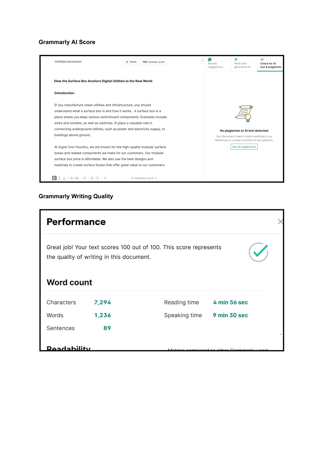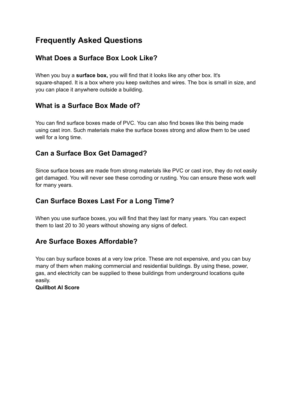 Frequently Asked Questions What Does a Surface Box Look Like? When you buy a surface box, you will find that it looks like any other box. It's square-shaped. It is a box where you keep switches and wires. The box is small in size, and you can place it anywhere outside a building. What is a Surface Box Made of? You can find surface boxes made of PVC. You can also find boxes like this being made using cast iron. Such materials make the surface boxes strong and allow them to be used well for a long time. Can a Surface Box Get Damaged? Since surface boxes are made from strong materials like PVC or cast iron, they do not easily get damaged. You will never see these corroding or rusting. You can ensure these work well for many years. Can Surface Boxes Last For a Long Time? When you use surface boxes, you will find that they last for many years. You can expect them to last 20 to 30 years without showing any signs of defect. Are Surface Boxes Affordable? You can buy surface boxes at a very low price. These are not expensive, and you can buy many of them when making commercial and residential buildings. By using these, power, gas, and electricity can be supplied to these buildings from underground locations quite easily. Quillbot AI Score