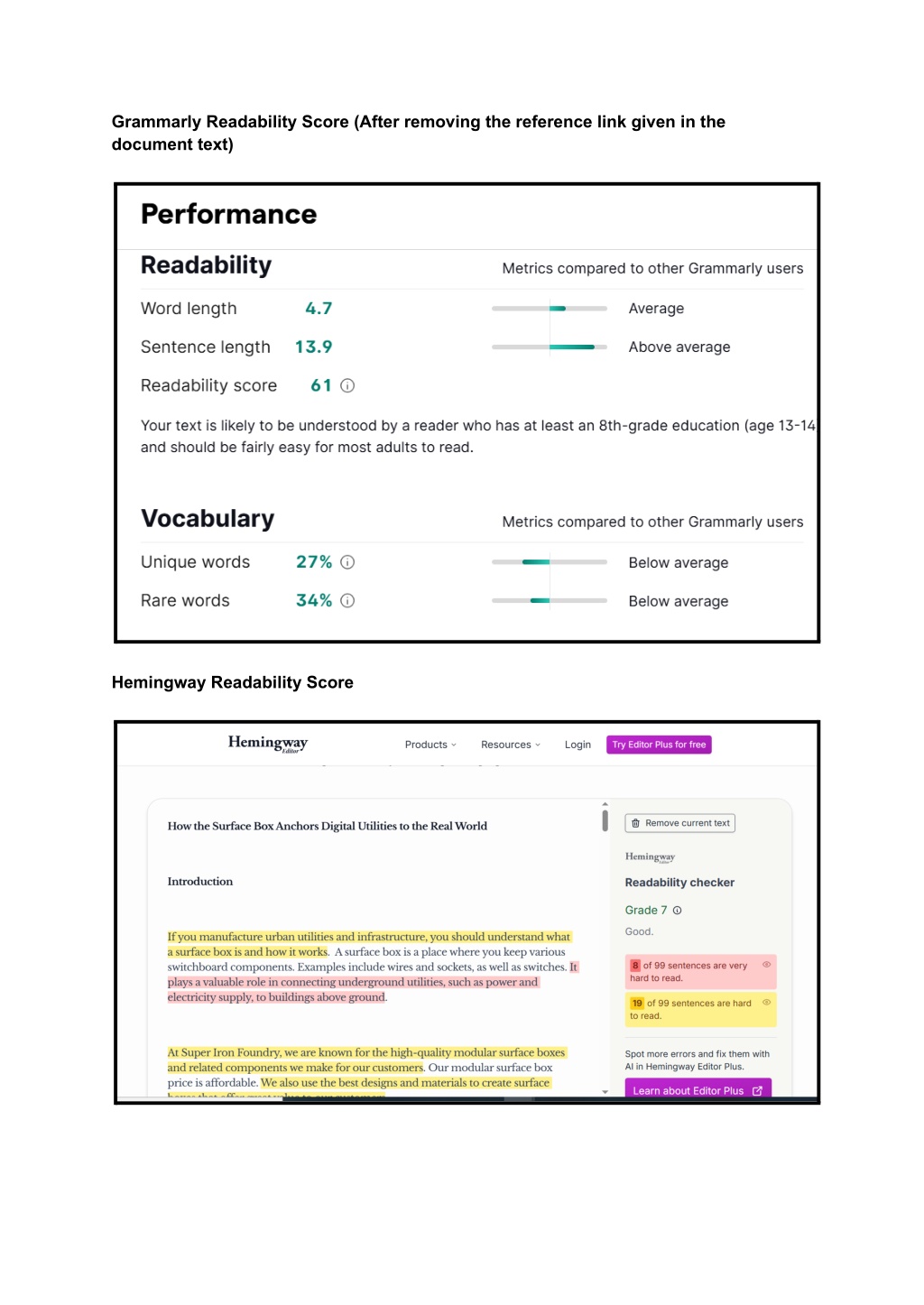 Grammarly Readability Score (After removing the reference link given in the document text) Hemingway Readability Score