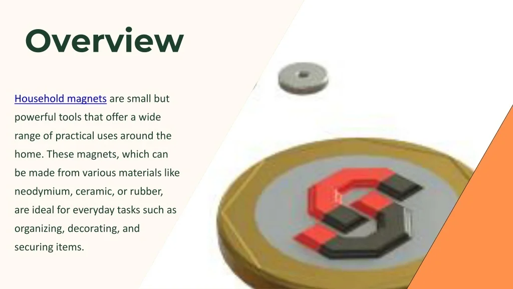 Overview Household magnets are small but powerful tools that offer a wide range of practical uses around the home. These magnets, which can be made from various materials like neodymium, ceramic, or rubber, are ideal for everyday tasks such as organizing, decorating, and securing items.