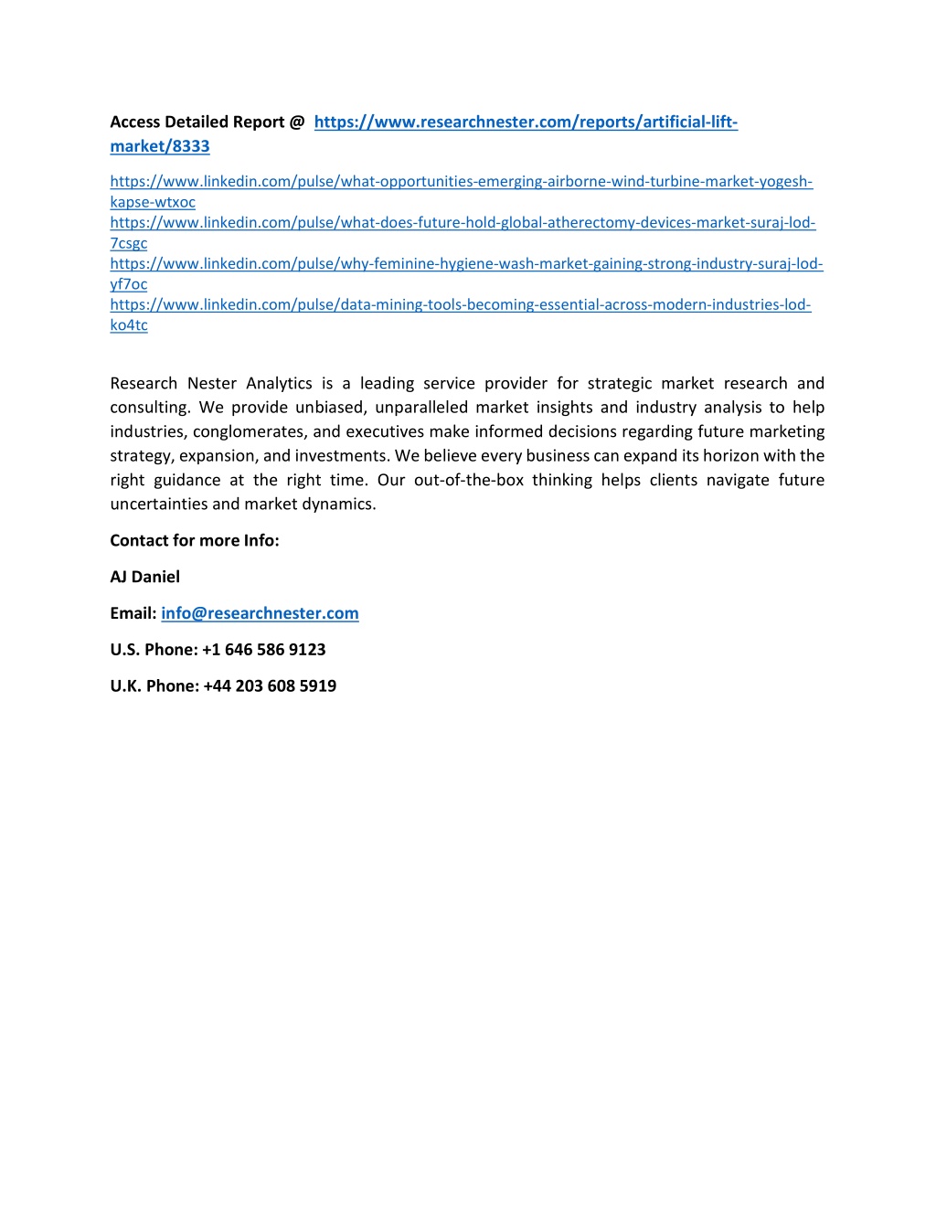 Access Detailed Report @ https://www.researchnester.com/reports/artificial-lift- market/8333 https://www.linkedin.com/pulse/what-opportunities-emerging-airborne-wind-turbine-market-yogesh- kapse-wtxoc https://www.linkedin.com/pulse/what-does-future-hold-global-atherectomy-devices-market-suraj-lod- 7csgc https://www.linkedin.com/pulse/why-feminine-hygiene-wash-market-gaining-strong-industry-suraj-lod- yf7oc https://www.linkedin.com/pulse/data-mining-tools-becoming-essential-across-modern-industries-lod- ko4tc Research Nester Analytics is a leading service provider for strategic market research and consulting. We provide unbiased, unparalleled market insights and industry analysis to help industries, conglomerates, and executives make informed decisions regarding future marketing strategy, expansion, and investments. We believe every business can expand its horizon with the right guidance at the right time. Our out-of-the-box thinking helps clients navigate future uncertainties and market dynamics. Contact for more Info: AJ Daniel Email: info@researchnester.com U.S. Phone: +1 646 586 9123 U.K. Phone: +44 203 608 5919