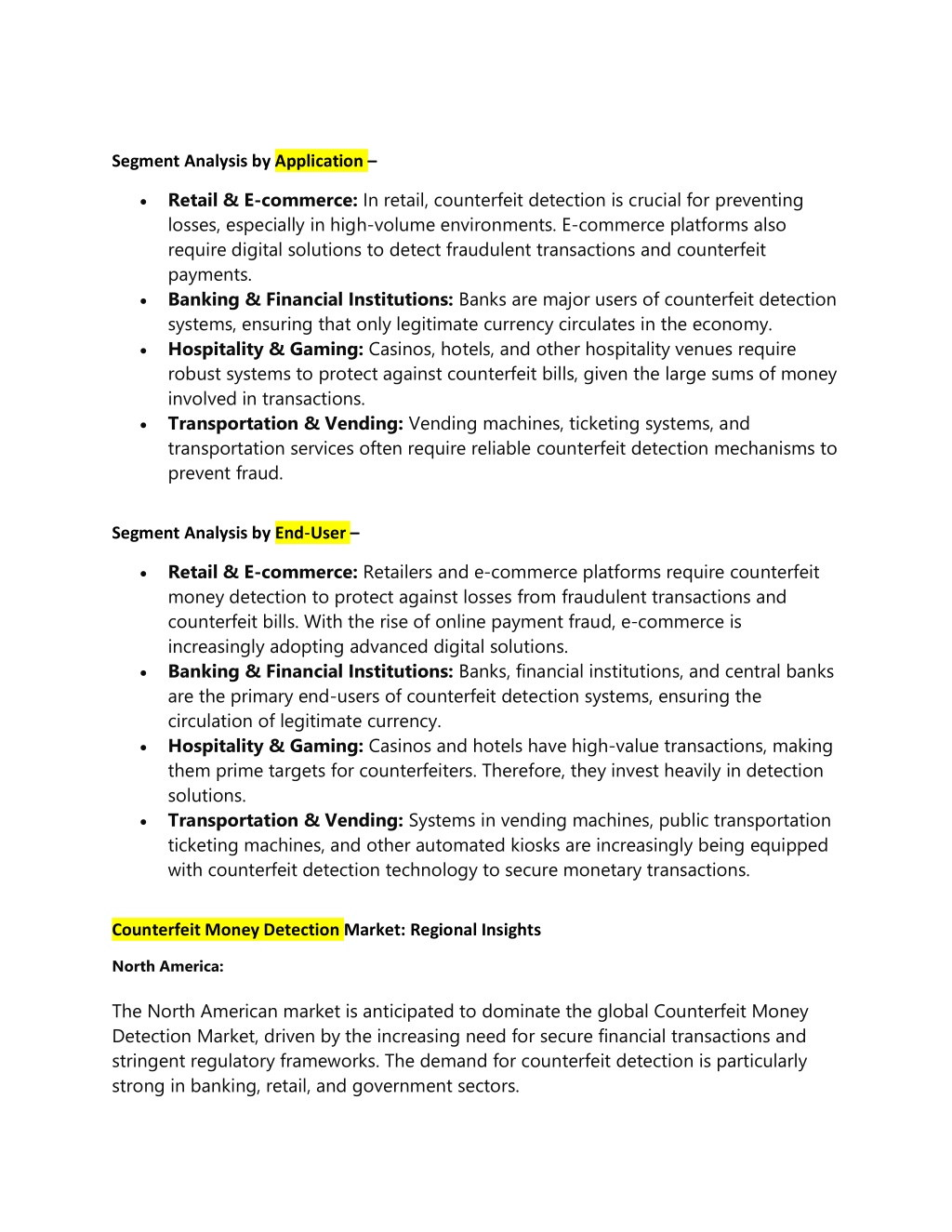 Segment Analysis by Application – Retail & E-commerce: In retail, counterfeit detection is crucial for preventing losses, especially in high-volume environments. E-commerce platforms also require digital solutions to detect fraudulent transactions and counterfeit payments. Banking & Financial Institutions: Banks are major users of counterfeit detection systems, ensuring that only legitimate currency circulates in the economy. Hospitality & Gaming: Casinos, hotels, and other hospitality venues require robust systems to protect against counterfeit bills, given the large sums of money involved in transactions. Transportation & Vending: Vending machines, ticketing systems, and transportation services often require reliable counterfeit detection mechanisms to prevent fraud. Segment Analysis by End- -User – Retail & E-commerce: Retailers and e-commerce platforms require counterfeit money detection to protect against losses from fraudulent transactions and counterfeit bills. With the rise of online payment fraud, e-commerce is increasingly adopting advanced digital solutions. Banking & Financial Institutions: Banks, financial institutions, and central banks are the primary end-users of counterfeit detection systems, ensuring the circulation of legitimate currency. Hospitality & Gaming: Casinos and hotels have high-value transactions, making them prime targets for counterfeiters. Therefore, they invest heavily in detection solutions. Transportation & Vending: Systems in vending machines, public transportation ticketing machines, and other automated kiosks are increasingly being equipped with counterfeit detection technology to secure monetary transactions. Counterfeit Money Detection Market: Regional Insights North America: The North American market is anticipated to dominate the global Counterfeit Money Detection Market, driven by the increasing need for secure financial transactions and stringent regulatory frameworks. The demand for counterfeit detection is particularly strong in banking, retail, and government sectors.