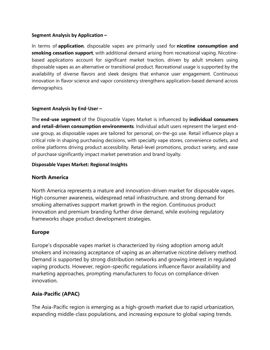 Segment Analysis by Application – In terms of application, disposable vapes are primarily used for nicotine consumption and smoking cessation support, with additional demand arising from recreational vaping. Nicotine- based applications account for significant market traction, driven by adult smokers using disposable vapes as an alternative or transitional product. Recreational usage is supported by the availability of diverse flavors and sleek designs that enhance user engagement. Continuous innovation in flavor science and vapor consistency strengthens application-based demand across demographics. Segment Analysis by End- -User – The end-use segment of the Disposable Vapes Market is influenced by individual consumers and retail-driven consumption environments. Individual adult users represent the largest end- use group, as disposable vapes are tailored for personal, on-the-go use. Retail influence plays a critical role in shaping purchasing decisions, with specialty vape stores, convenience outlets, and online platforms driving product accessibility. Retail-level promotions, product variety, and ease of purchase significantly impact market penetration and brand loyalty. Disposable Vapes Market: Regional Insights North America North America represents a mature and innovation-driven market for disposable vapes. High consumer awareness, widespread retail infrastructure, and strong demand for smoking alternatives support market growth in the region. Continuous product innovation and premium branding further drive demand, while evolving regulatory frameworks shape product development strategies. Europe Europe’s disposable vapes market is characterized by rising adoption among adult smokers and increasing acceptance of vaping as an alternative nicotine delivery method. Demand is supported by strong distribution networks and growing interest in regulated vaping products. However, region-specific regulations influence flavor availability and marketing approaches, prompting manufacturers to focus on compliance-driven innovation. Asia-Pacific (APAC) The Asia-Pacific region is emerging as a high-growth market due to rapid urbanization, expanding middle-class populations, and increasing exposure to global vaping trends.