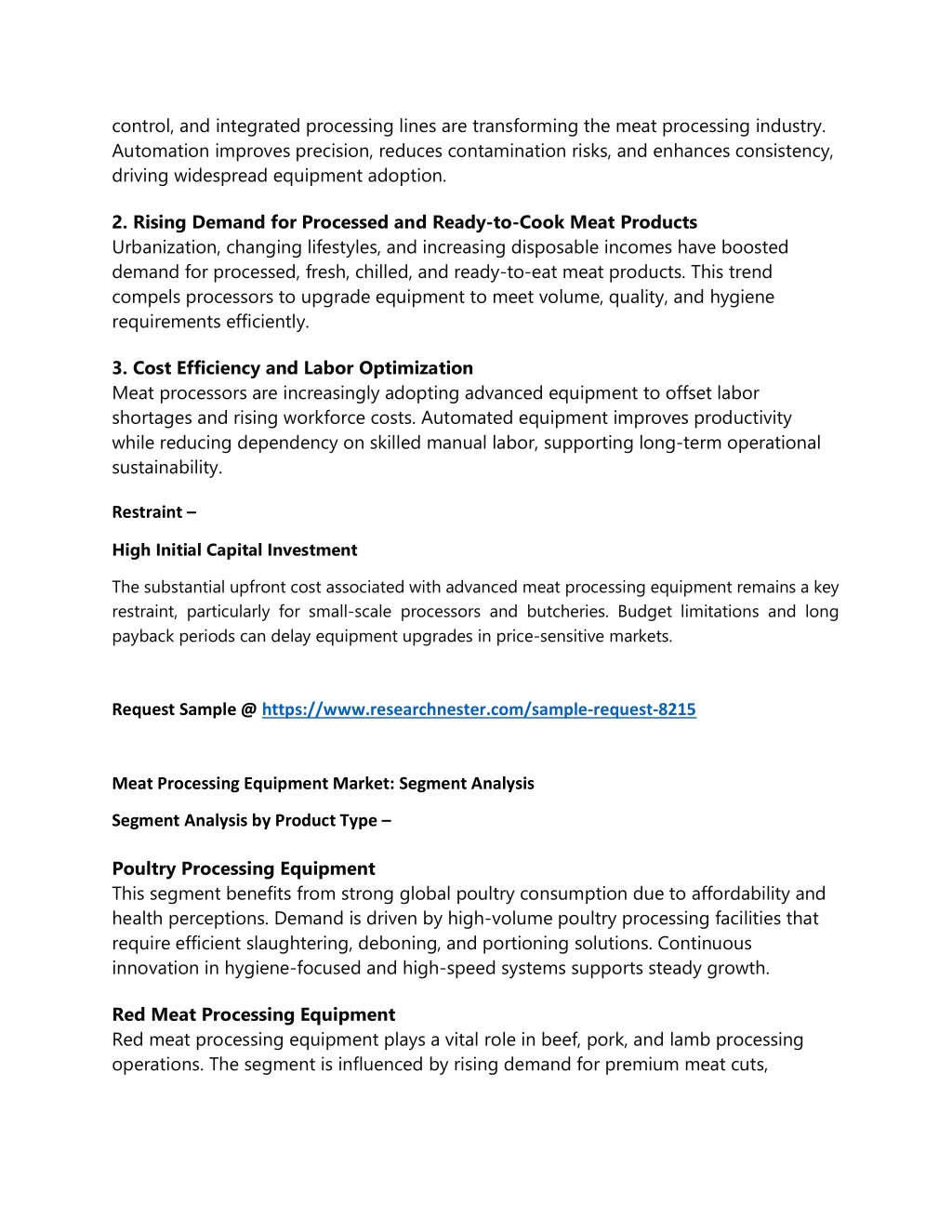 control, and integrated processing lines are transforming the meat processing industry. Automation improves precision, reduces contamination risks, and enhances consistency, driving widespread equipment adoption. 2. Rising Demand for Processed and Ready-to-Cook Meat Products Urbanization, changing lifestyles, and increasing disposable incomes have boosted demand for processed, fresh, chilled, and ready-to-eat meat products. This trend compels processors to upgrade equipment to meet volume, quality, and hygiene requirements efficiently. 3. Cost Efficiency and Labor Optimization Meat processors are increasingly adopting advanced equipment to offset labor shortages and rising workforce costs. Automated equipment improves productivity while reducing dependency on skilled manual labor, supporting long-term operational sustainability. Restraint – High Initial Capital Investment The substantial upfront cost associated with advanced meat processing equipment remains a key restraint, particularly for small-scale processors and butcheries. Budget limitations and long payback periods can delay equipment upgrades in price-sensitive markets. Request Sample @ https://www.researchnester.com/sample-request-8215 Meat Processing Equipment Market: Segment Analysis Segment Analysis by Product Type – Poultry Processing Equipment This segment benefits from strong global poultry consumption due to affordability and health perceptions. Demand is driven by high-volume poultry processing facilities that require efficient slaughtering, deboning, and portioning solutions. Continuous innovation in hygiene-focused and high-speed systems supports steady growth. Red Meat Processing Equipment Red meat processing equipment plays a vital role in beef, pork, and lamb processing operations. The segment is influenced by rising demand for premium meat cuts,