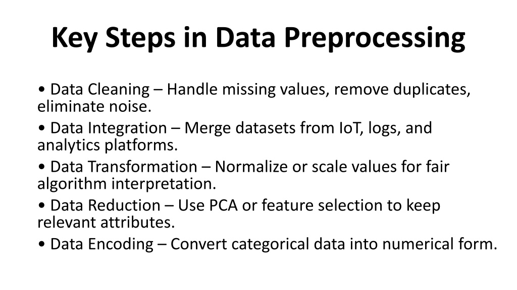 3. Key Steps in Data Preprocessing • Data Cleaning – Handle missing values, remove duplicates, eliminate noise. • Data Integration – Merge datasets from IoT, logs, and analytics platforms. • Data Transformation – Normalize or scale values for fair algorithm interpretation. • Data Reduction – Use PCA or feature selection to keep relevant attributes. • Data Encoding – Convert categorical data into numerical form.