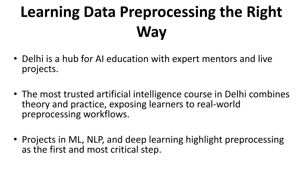 7. Learning Data Preprocessing the Right Way • Delhi is a hub for AI education with expert mentors and live projects. • The most trusted artificial intelligence course in Delhi combines theory and practice, exposing learners to real-world preprocessing workflows. • Projects in ML, NLP, and deep learning highlight preprocessing as the first and most critical step.