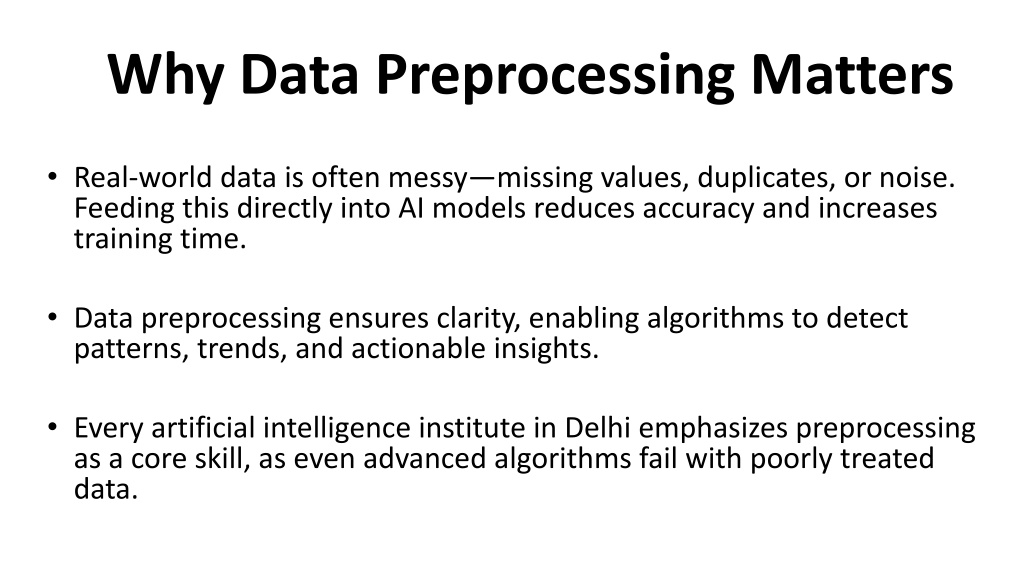 2. Why Data Preprocessing Matters • Real-world data is often messy—missing values, duplicates, or noise. Feeding this directly into AI models reduces accuracy and increases training time. • Data preprocessing ensures clarity, enabling algorithms to detect patterns, trends, and actionable insights. • Every artificial intelligence institute in Delhi emphasizes preprocessing as a core skill, as even advanced algorithms fail with poorly treated data.
